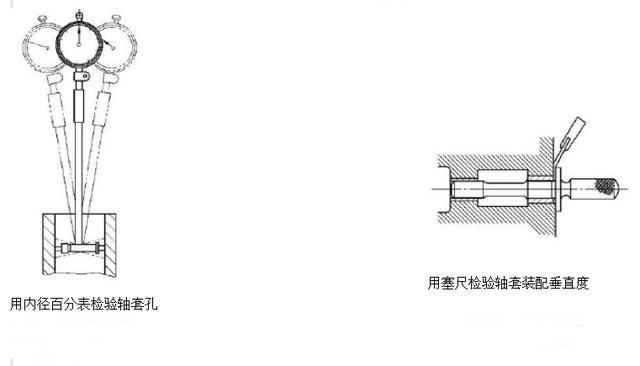 ?。?)軸套的檢驗(yàn) 用內(nèi)徑百分表,見下圖,在孔的兩三處作相互垂直方向上的檢驗(yàn),可以測定軸套的圓柱度、錐度和尺寸。