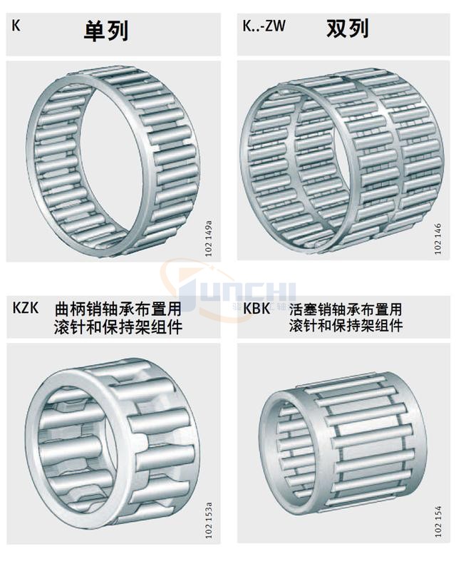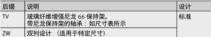滾針和保持架組件的保持架有尼龍保持架和沖壓鋼板保持架。尼龍保持架的后綴為 TV 且只有特殊尺寸。