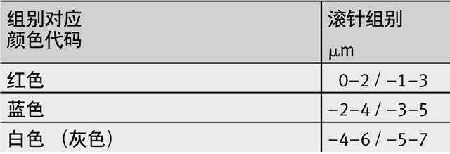 根據(jù)下表中標(biāo)準(zhǔn)滾針分組提供滾針和保持架組件。每個(gè)滾針和保持架組件只包含同一組別的滾針。包裝上印有組別并印有代表組別的顏色代碼,請見下表。